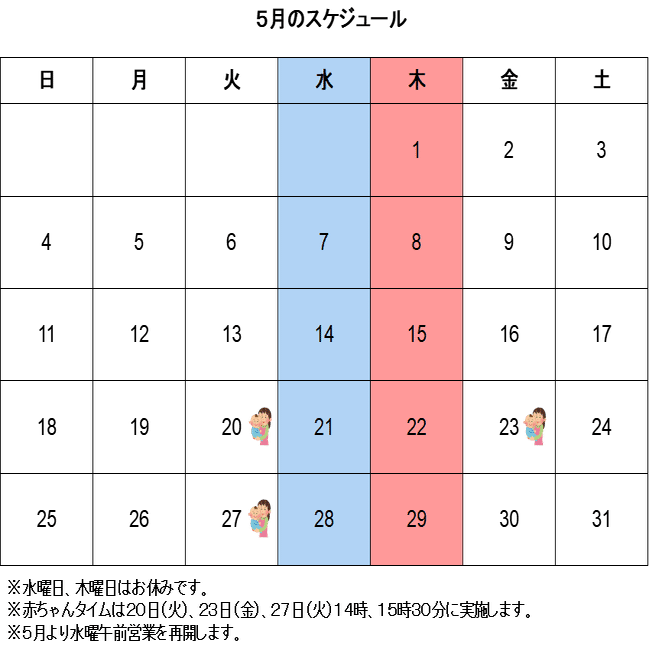 ②赤ちゃんタイムは20日(火)、23日(金)、27日(火)14時、15時30分に実施します。